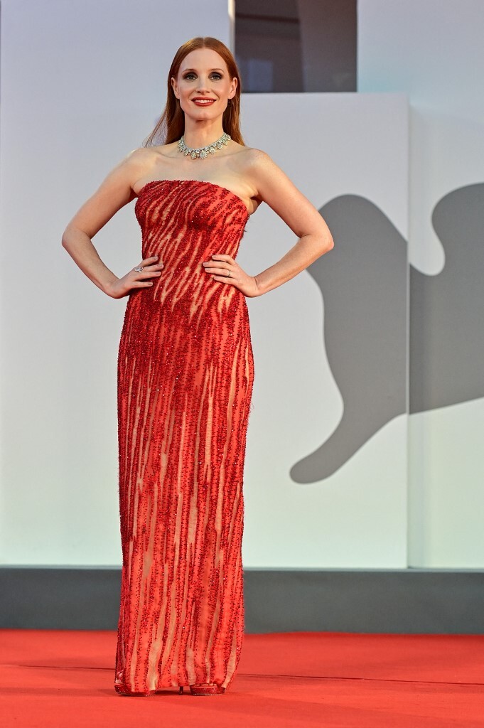 Diễn viên Jessica Chastain được tôn chiều cao với đầm quây ngực dáng suông tại buổi ra mắt "Scenes from a Marriage".