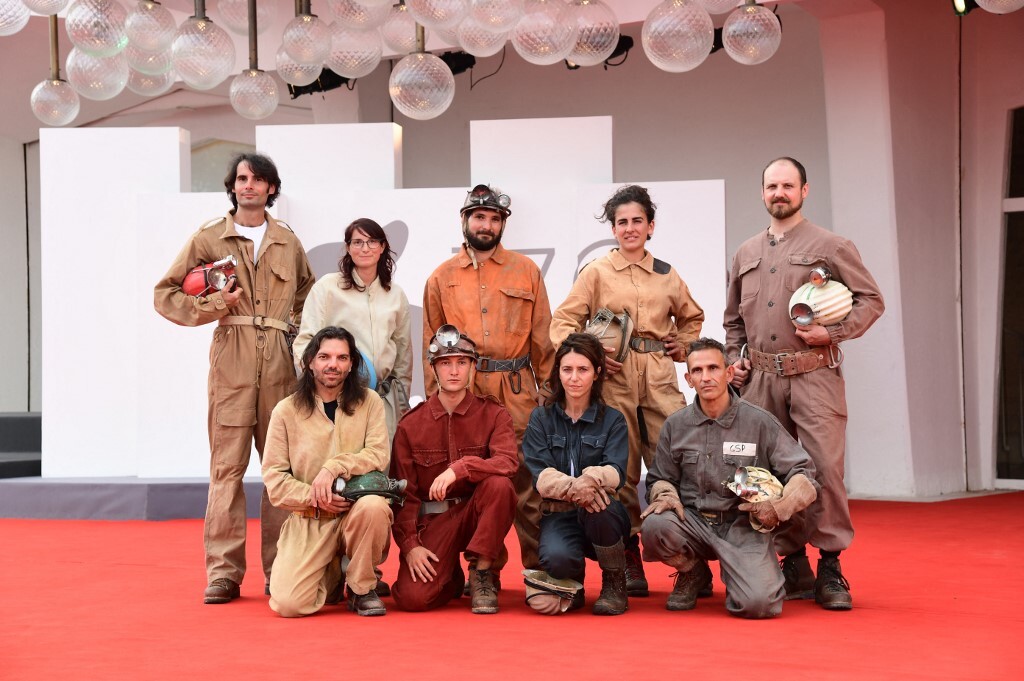 Đoàn nghệ sĩ gồm đạo diễn, quay phim, biên kịch... lưu lại khoảnh khắc trên thảm đỏ. Ở liên hoan phim năm nay, "The Hole" tranh giải Sư Tử Vàng. Bộ phim kể về hành trình khám phá của nhân vật Bifurto Abyss trong các hang động sâu gần 700 m Pollino năm 1961.